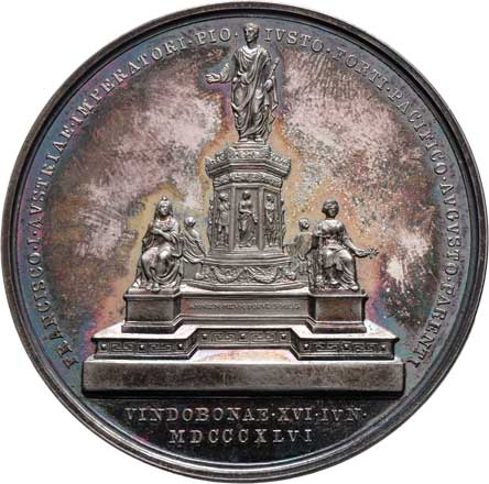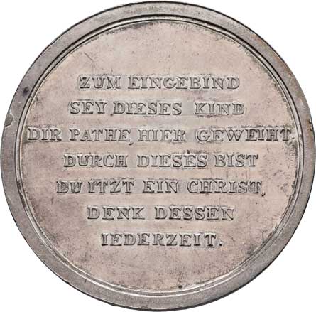 portrét zprava, němec. opis / tři alegorické postavy, opis a nápis, Sign., měď 70 mm, 130.816g, nep.hr. |