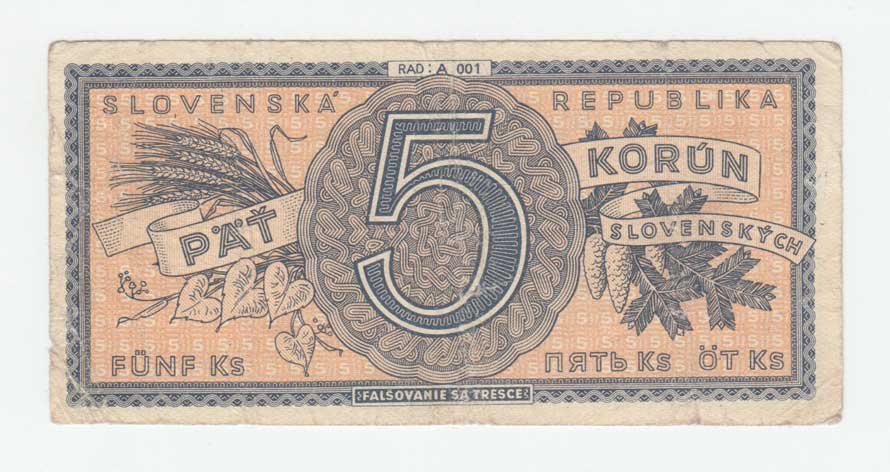3127. 5 Koruna 1945, série A001, BHK.55a, He.60a,