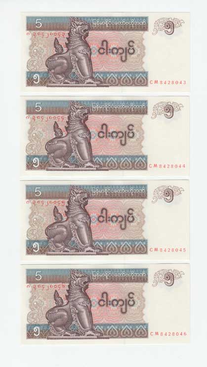 | 3404. | 5 Kyats (1997), Pick.70b, čtyři následující čísla | N | 20,- | --.- |