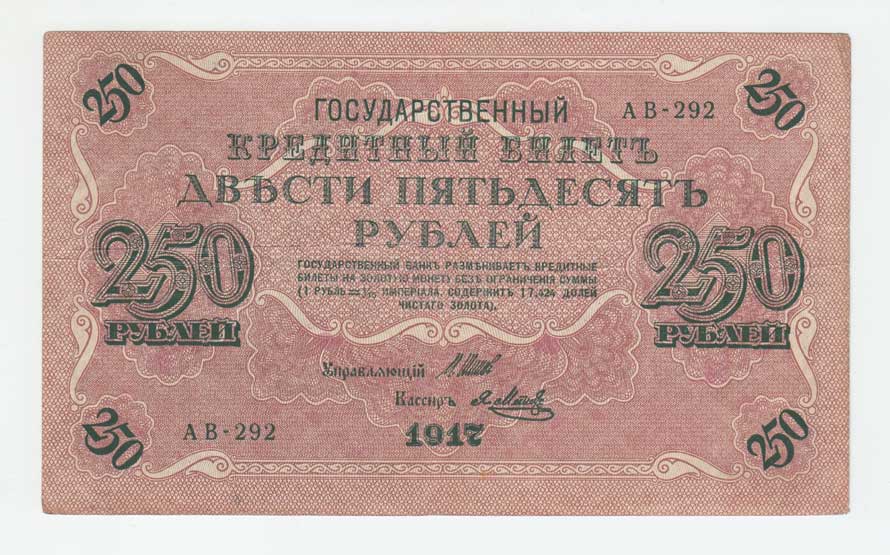 | 3701. | 250 Rubl 1917, Pick.36 - Šipov / Ja.Metz, v reversu