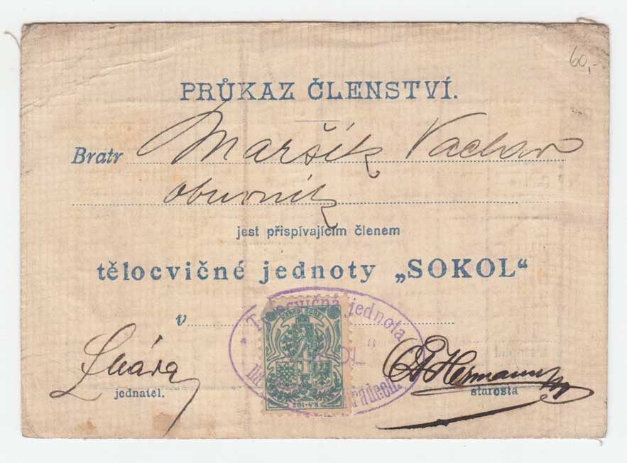 členství tělovýchovné jednoty Sokol, známka, razítka, podpisy, dobře |