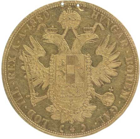 22. | 4 Dukát 1880 b.zn. dvě dírky po korunce | tém.0/0 | 20000,- | --.- |