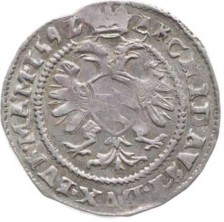 369. | Bílý groš 1592, K.Hora-Šatný, J.13a, MKČ.376 dr.ned. | 1/1 | 600,- | --.- |