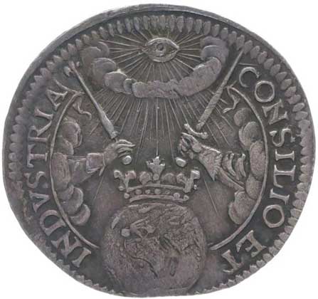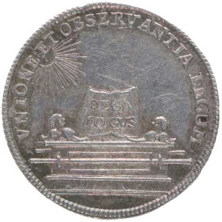 Pět rukou drží korunu, sluneční paprsky, opis / 7řádk.nápis ve věnci, Ag 26 mm, 7,01 g, Nov.V/A-6a, Do.2045, Kil.2899 R! |