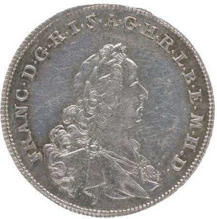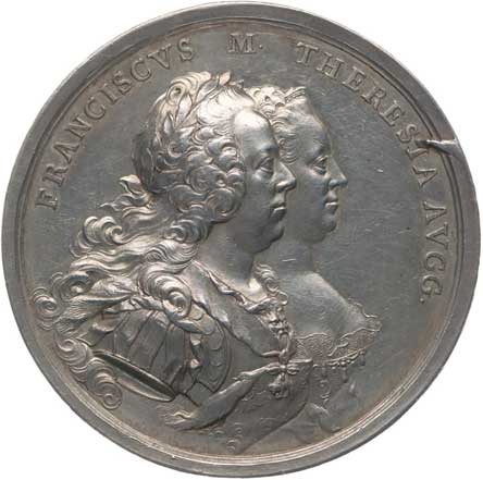 Dvojportrét Frant.Lotrinského a Marie Terezie zprava, opis / stojící Bellona s mírovými atributy podává věnec klečící Moravii, 2řádk.nápis, opis, Nesign., Ag 46 mm, 34,96 g, Mo.1865, SD.136a LG.XIV/146 RR! |