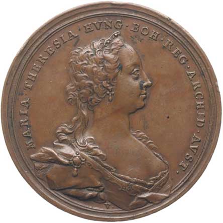 Portrét Marie Terezie, opis / princ mezi dvěma stojícími alegorickými postavami, 3řádk.nápis, opis, Sign.V, Bronz 44 mm, 29.37 g, Wu.5999, Wel.7848 R! |