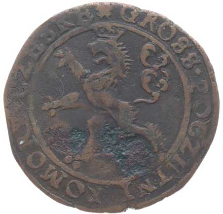 579. | Početní groš měděný b.l., český lev drží tři razidla, opis / český