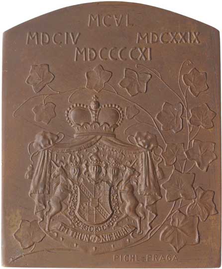 Poprsí čelně, 5řádk.nápis / čtyři vročení, korunovaný knížecí znak Sign., Bronz.plaketa 46x56 mm |