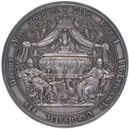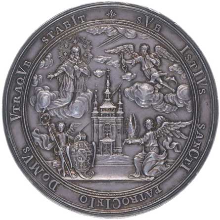 Náhrobek s postavami Víry a Naděje, opis /světec, tři andělé, chrám, opis, Nesign., Ag 72 mm, 71,73 g, Lich.Mayer.467, Mo.2901 RR! |