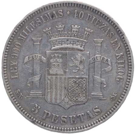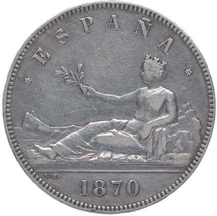 1450. | 5 Peseta 1870/70 Madrid, Y.60, KM.655 | -1/1 | 800,- | --.- |