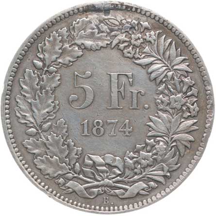 1453. | 5 Frank 1874 B., KM.11 st. po o., nazn.dírka R! | 1/1 | 1500,- | --.- |