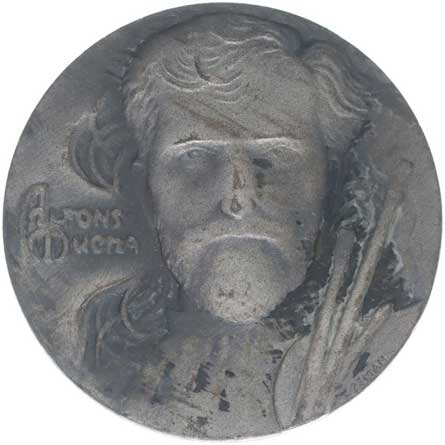 Portrét Alfonse Muchy čelně, nápis / motiv z plakátu, nápis, Sign., Punc., Ag 900/1000, 30 mm, 16,2 g, BK.17/5, MF.A13/5a náklad 118 ks R! |