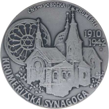 Kroměřížská synagoga 1910 - 1942, portrét čelně mírně zprava, 4řádk. nápis, opis / pohled na synagogu, opis, Sign., Punc.925, Ag 50 mm, 69.6 g, nákl.20 ks, číslov. na hr."6", MF.A18/19a R! |