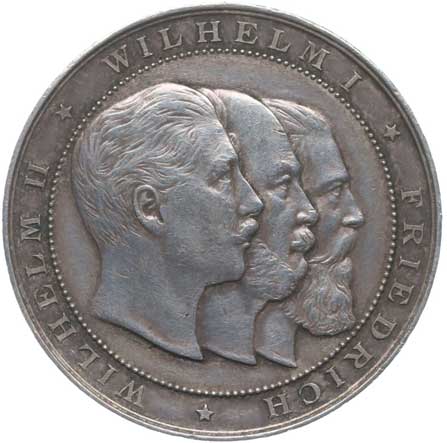 Trojpoprtrét císařů Viléma I., Friedricha a Viléma II., opis / říšská orlice s vročením v prsním štítku, v perutích jména vítězných měst, opis, Ag 34 mm, 19,38 g, nápis na hraně JUBILAEUM SEGENSMÜNZ |