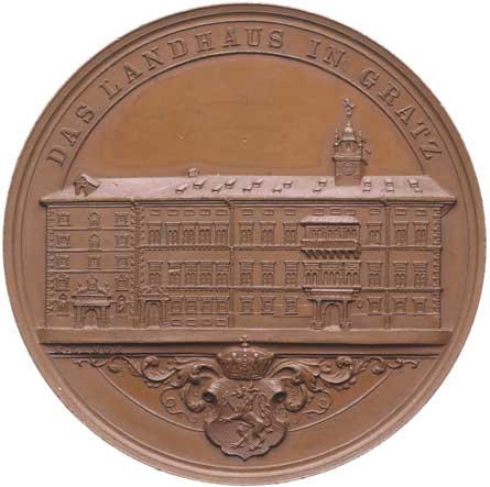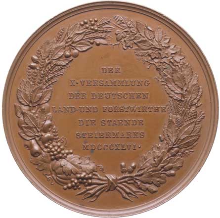 hospodářů 1846, pohled na zemský dům v Grazu, opis / 7řádk.něm. text ve věnci, Sign.K.Lange, Cu 49 mm, Ho.6242, Un.1851 |