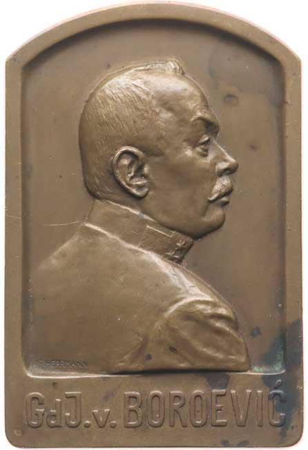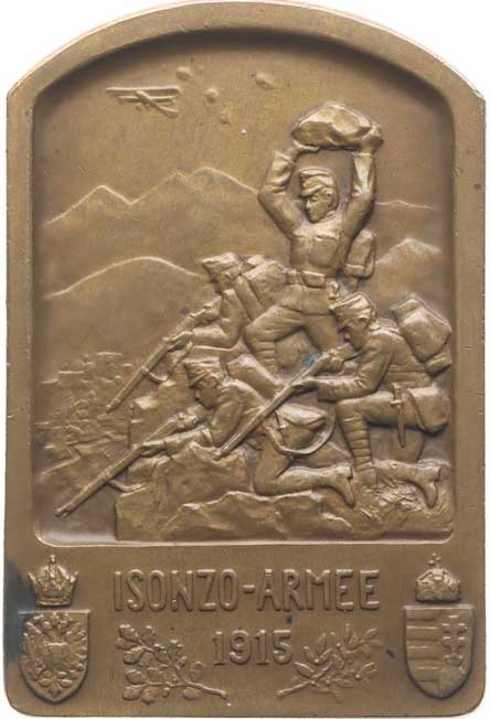 Poprsí zprava, nápis / bitevní scéna, 2řádk.nápia mezi znaky Rakouska a Uher, Sign., Bronz.plaketa 47x70 mm, Haus.7234 R! |