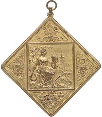 Žena s lyrou v rámečku, kolem znaky Rakouska a Štýrska / 7řádk. nápis ve věnci v kruhu, Sign.K.Lacher, Pozlac.bronz.klipa 65x65 mm orig.raž.ouško se závěsem |