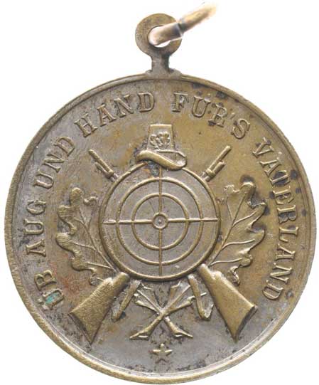 Terč překřížený puškami, něm.opis /3řádk.nápid ve věnci Postř.bronz 29 mm orig.raž.ouško |