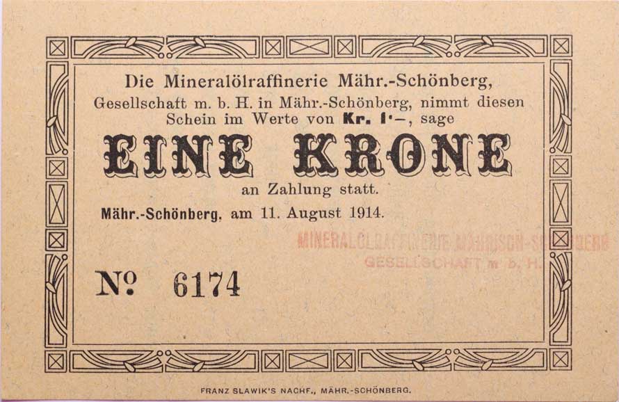 3405. | Šumperk (M.Schönberg), mineral.raf., 1 Krone 11.8.1914,