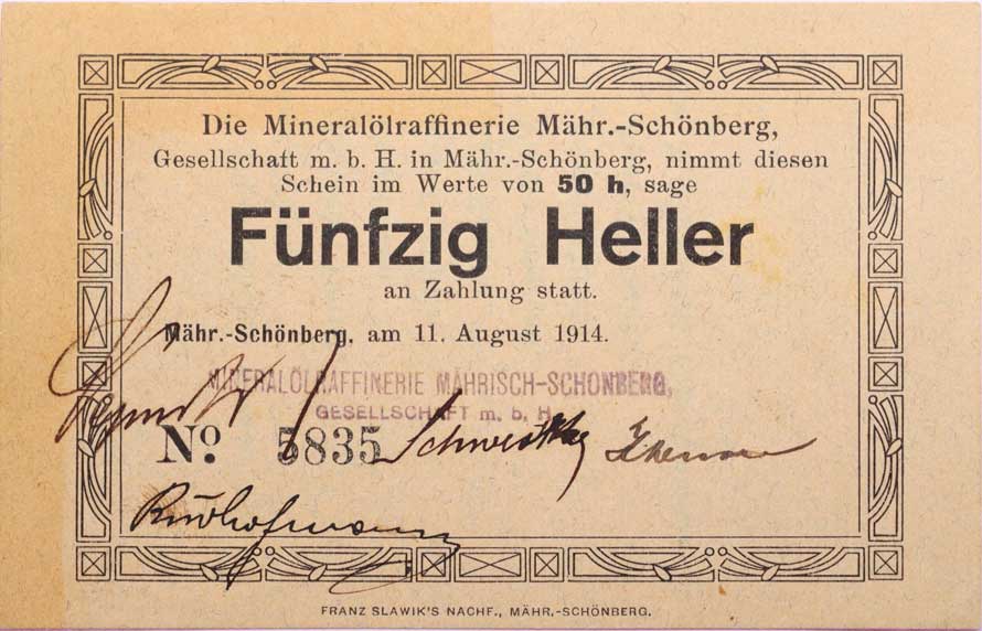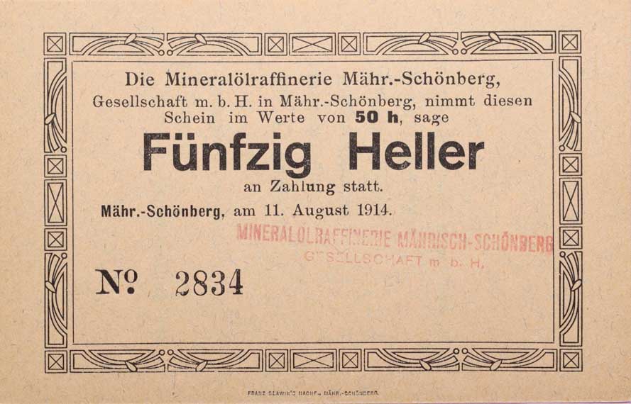 3409. | Šumperk (M.Schönberg) mineral.raf., 50 Heller 11.8.1914, č.443