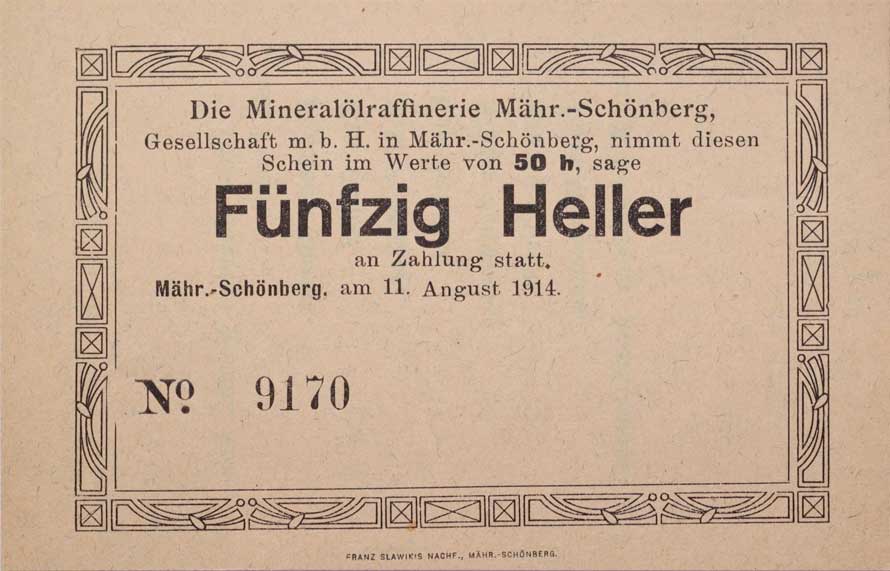3407. | Šumperk (M.Schönberg) mineral.raf., 50 Heller 11.8.1914, č.9170