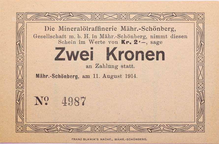 3415. | Šumperk (M.Schönberg), mineral.raf., 2 Krone 11.8.1914, No.4987,