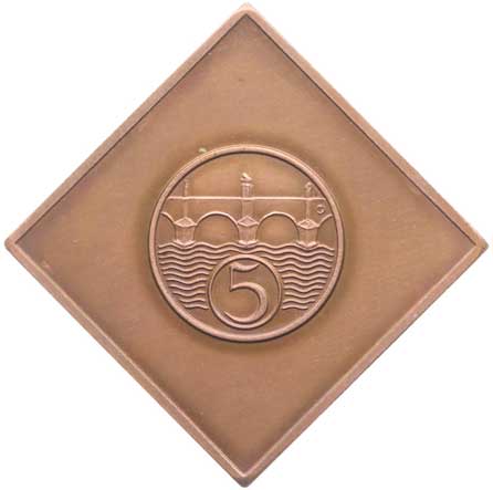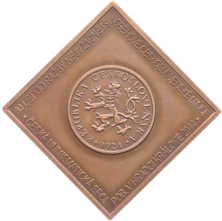 Replika licní strany čs.mince / replika rubní strany čs.mince, opis Cu klipa 28x28 mm, 12,8 g, MF.A10/34d, náklad 71 ks |