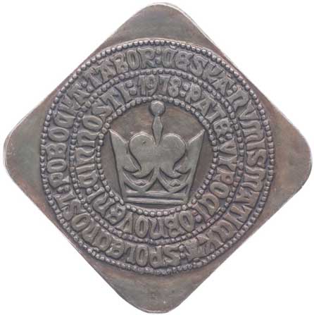Hlava zprava, opis / pohled na kostel, znak města, opis, 1974 - 1994 Sign.D. (T.R.Dušek), Litá Sn kompozice 62 mm |
