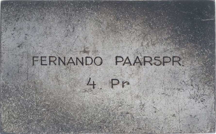 Skákající kůň s jezdcem, 2řádk.nápis / vyryto FERNANDO PARRSPR. 4.Pr, Bílý kov 81x51 mm |