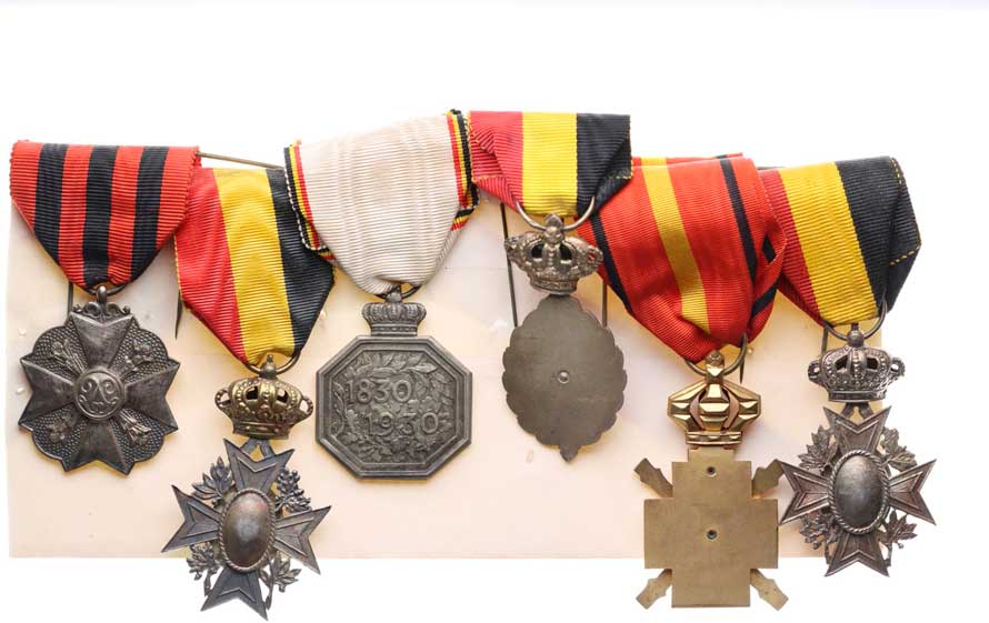 za průmyslové zásluhy II.tř. 2) pamětní záslužný kříž 1918-29 3) vyznamenání práce II.třídy 4) medaile na 100 let Belgie 5) vyznamenání práceza průmyslové zásluhy I.třídy 6) stříbrná medaile za dlouholetou službu orig.stuhy celk.6 ks |