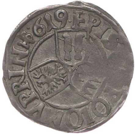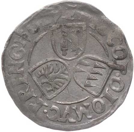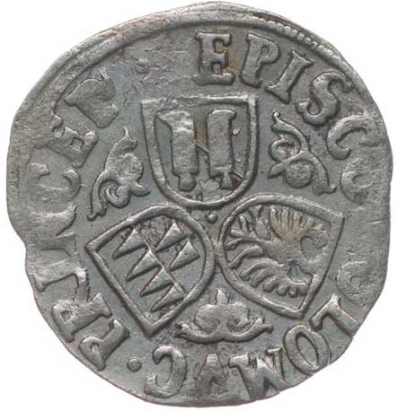 494. 1/2 Batzen (2 Krejcar) 1650, čtyřdílný znak, opis / stojící sv.Kilián,