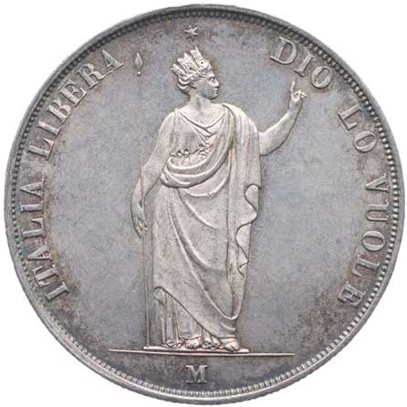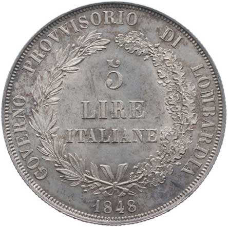 919. 5 Lira 1848 M - dlouhá stuha, Cr.22, AM.1b, Her.3, Ves.12b 0/0 6000,- --.-