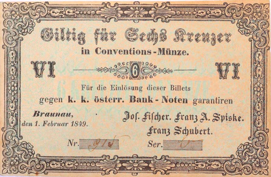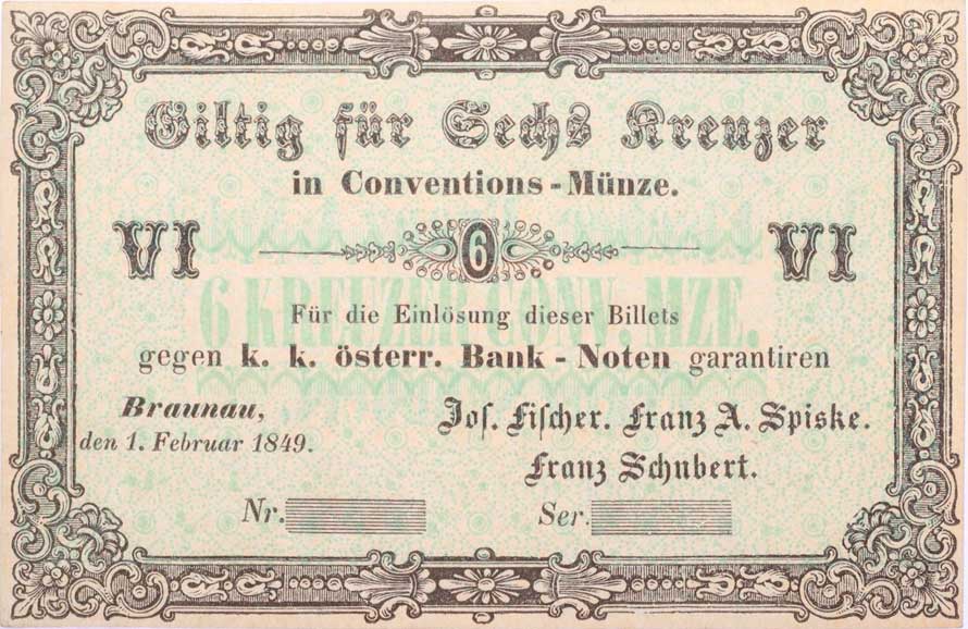 | 1149. | Broumov (Braunau), 6 Krejcar 1.2.1849, J.Fischer, F.A.Spiske,