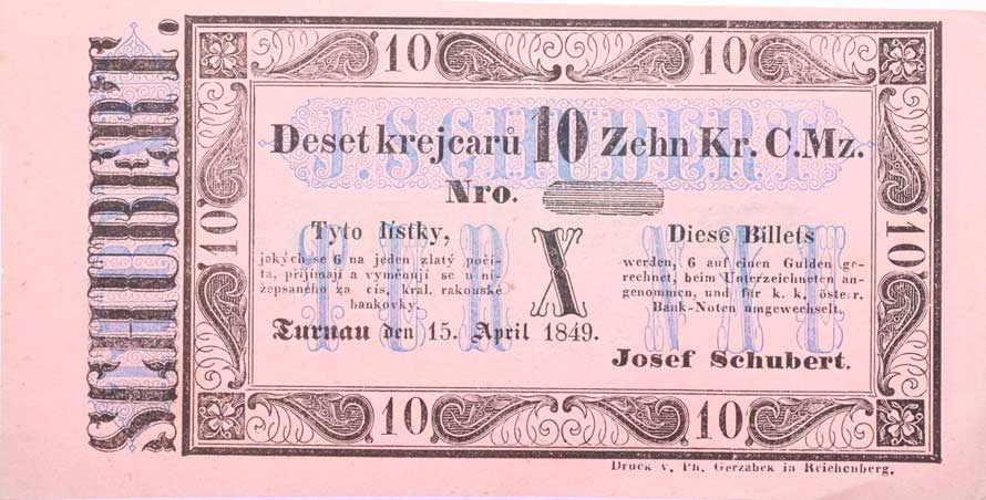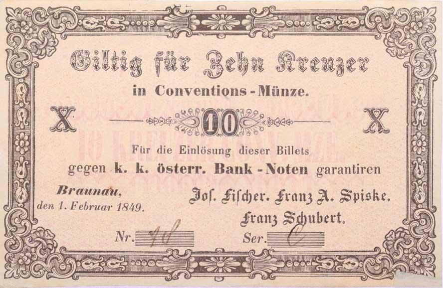 | 1151. | Broumov (Braunau), 10 Krejcar 1.2.1849, J.Fischer, F.A.Spiske,