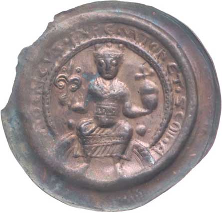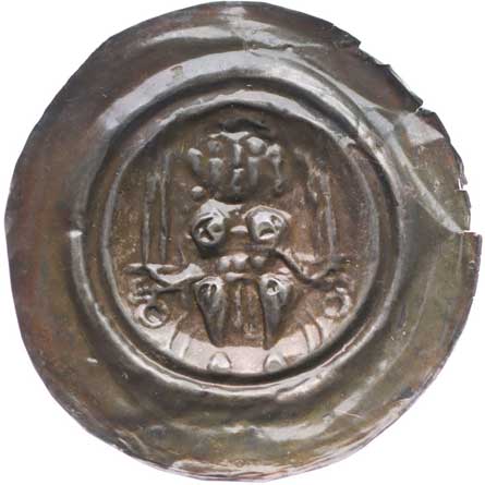 1229. Velký brakteát - postava sedící na trůně čelně s mečem v obou