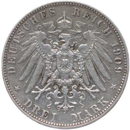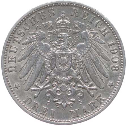 1254. 3 Marka 1908 D, KM.515, J.47 -1/1 400,- --.-