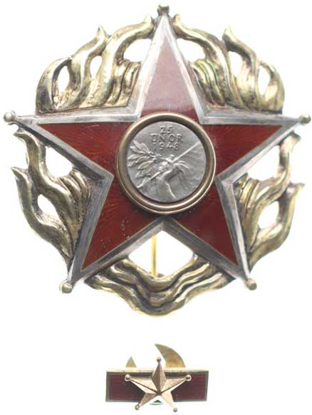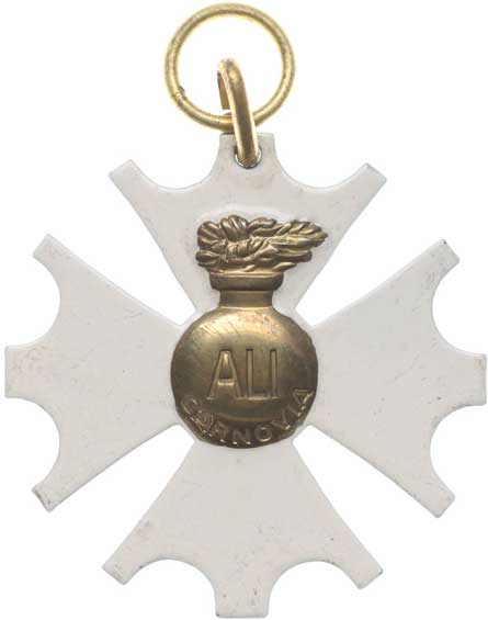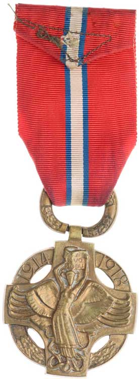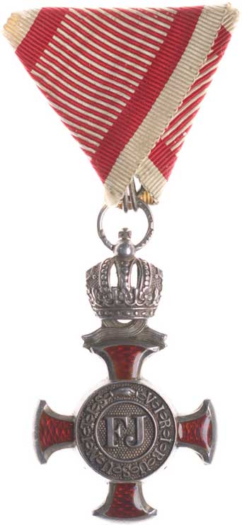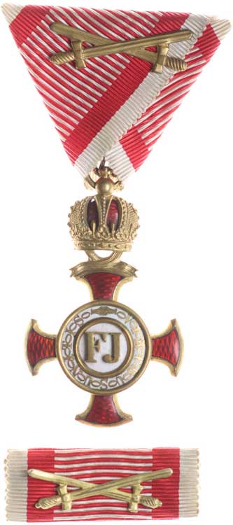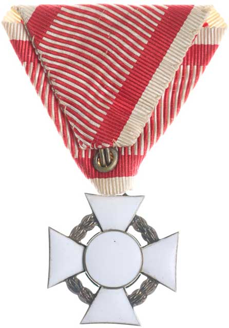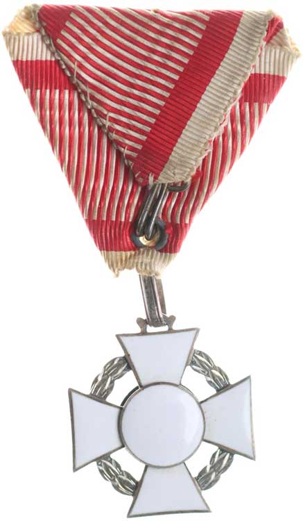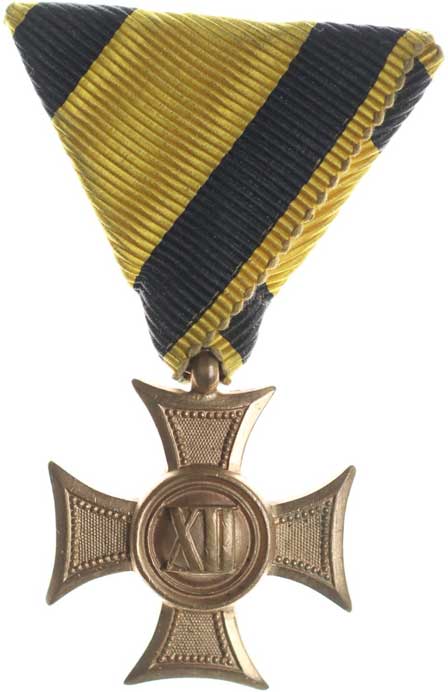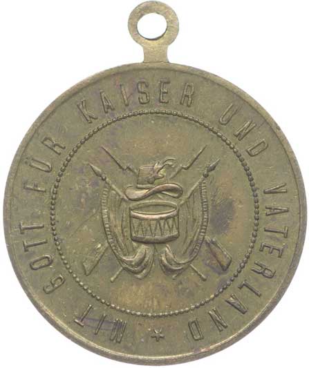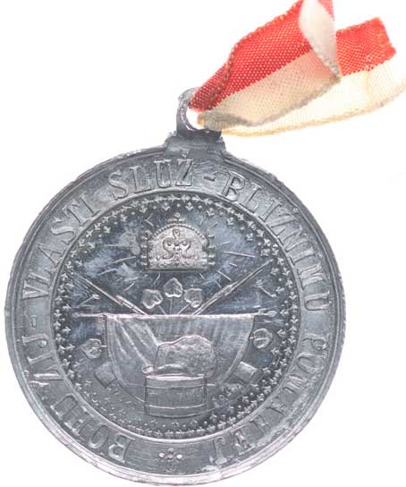 8.9.1877, vojenské atributy ve věnci / 7řádk.nápis ve věnci Sn 29 mm orig.raž.ouško s červenou stužkou |