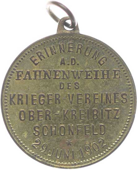 svěcení praporu 29.6.1902, poprsí císaře zprava, opis / 6řádk.nápis, opis, Pozlac.bronz 28 mm orig.raž.ouško se závěsem |