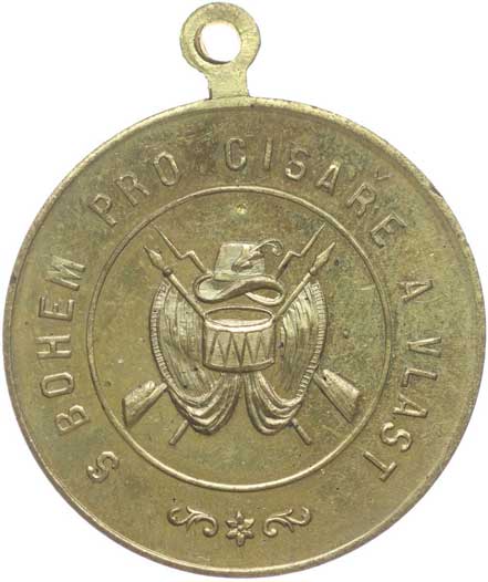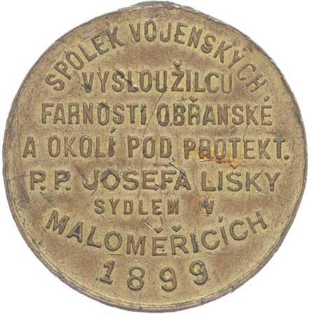 pod protekt. p.p. Josefa Lišky 1899, vojenské atributy ve věnci / 8řádk.nápis, Pozlac.bronz 33 mm odstr.ouško |