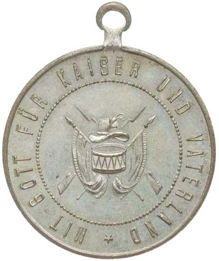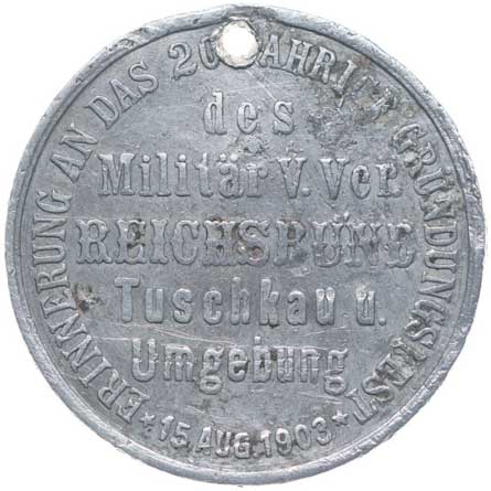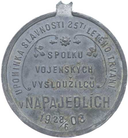 vysloužilců 28.6.1903, korunované vojenské atributy s praporem, bubnem a psem, opis / 4řádk.nápis, opis, Sn 34 mm vyl.ouško |