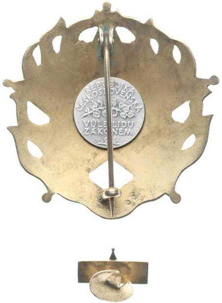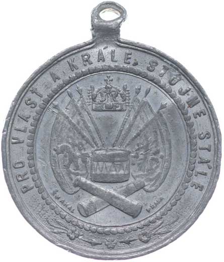 korunov.vojenské atributy s praporem, bubnem a psíhlavou, český opis / 4řádk.český nápis, opis, Sign.Šmakal Praha, Sn 33,5 mm orig.raž.ouško s bikolorou |