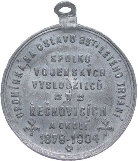 vojenských vysloužilců 1879 - 1904, koruov. vojenské atributy s praporem, bubnem a psem, český opis / 6řádk.nápis, český opis, Pb 34 mm orig.raž.ouško |