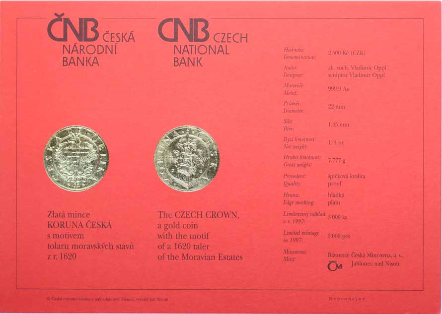 | 1462. | Karta (certifikát) pro minci 2500 Kč 1997 - tolar Moravských stavů | N | 300,- | --.- |