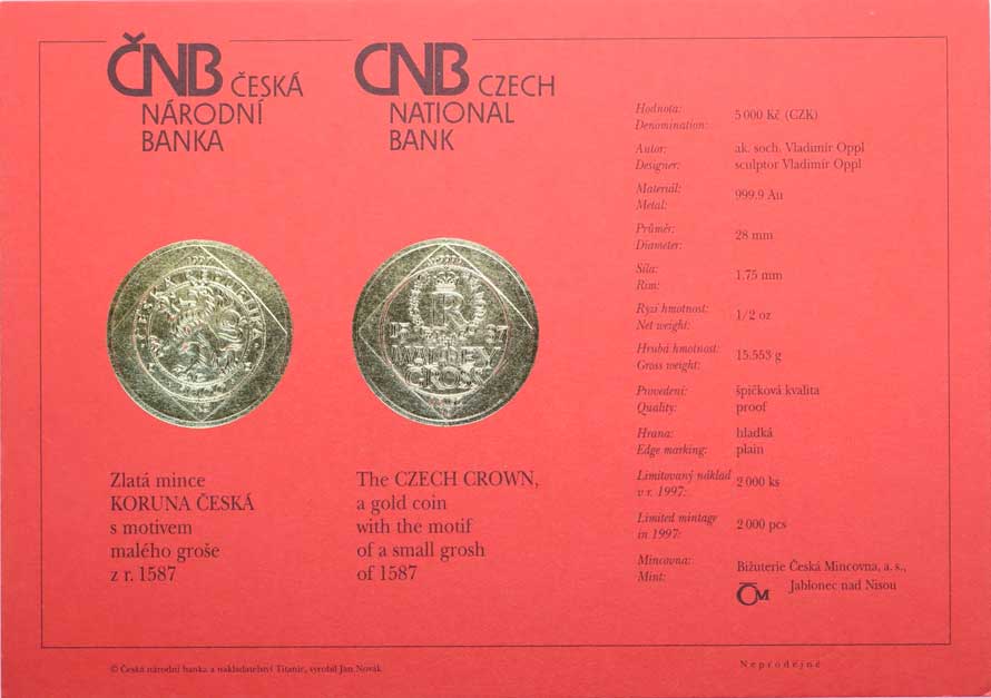 | 1463. | Karta (certifikát) pro minci 5000 Kč 1997 - malý groš | N | 300,- | --.- |