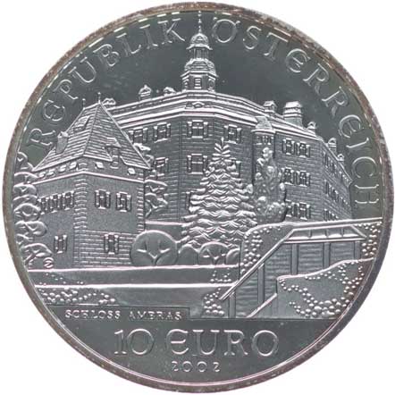| 3098. | Rakousko - 10 Euro 2002 - zámek Ambras, Punc.925 Ag 32 mm, 17,30 g