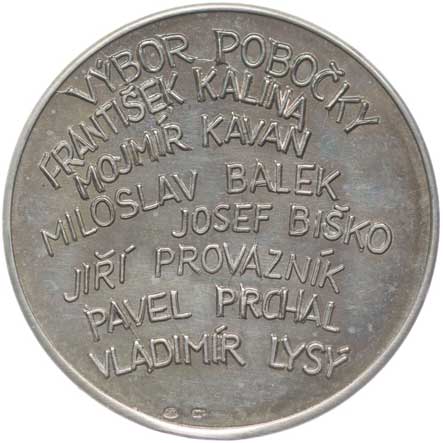 Motiv Zelené brány se dvěma domy, 3řádk.nápis, opis / 8řádk. jména výboru pobočky, autor L.Novotný, Punc. Ag 35 mm, 20 g, MF.A27/9a, náklad: 32 ks R! |