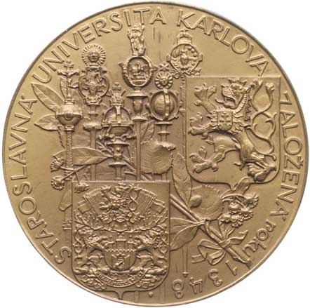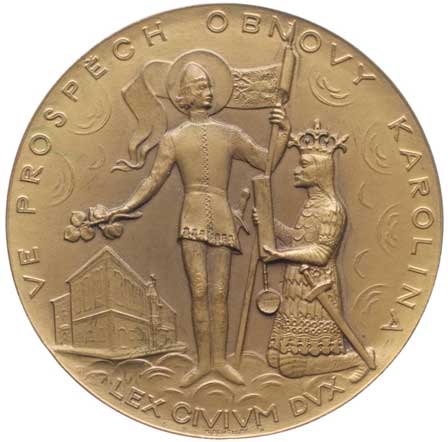 Znaky Prahy a ČSR, v pozadí univ.insigie, opis / klečící Karel IV. před Sv.Václavem, opis, Sign., Bronz 55 mm orig.etue |