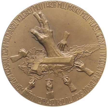 Mapa republiky s pahýlem lípy, ruce uchvatitelů, opis / alegor.postava, symboly, opis, Sign., Bronz 55 mm, 58,41 g |