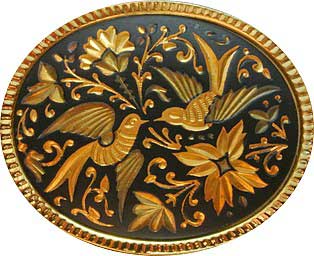 1329. | Ovál - gravírovaný zlacený šperk, na černém pozadí s ptáčky a rostlinnými