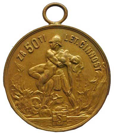 právě koupala, protože je úplně nahá a hasič toho taky nemá moc na sobě Svaz dobrovolného hasičstva českosloven. Lipové větvičky, lev vlevo, " v kříži Bz 40 mm, pův.ouš. |